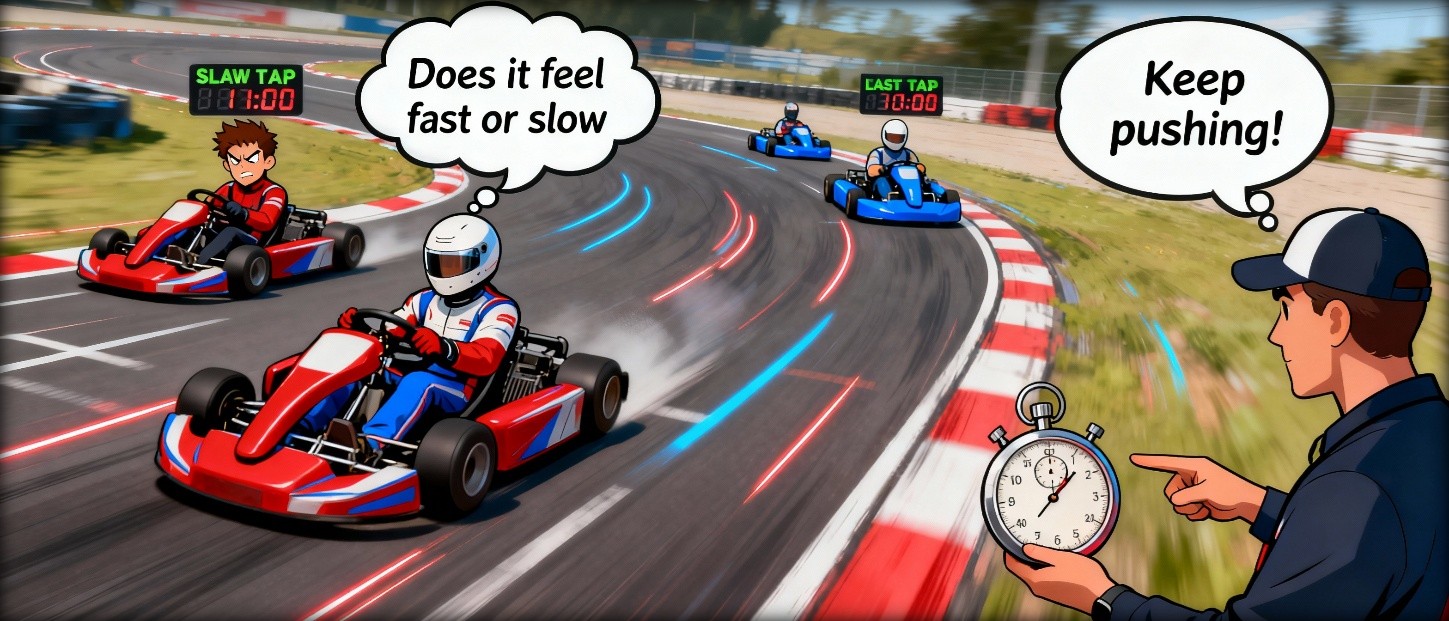 When racing go-karts, it’s easy to fall into the trap of believing that feeling fast equates to going fast. This often leads to overly hasty reactions, entering corners too fast, braking late, over-correcting, and fighting the kart throughout the race. From an outsider’s perspective, it looks messy and slow, even though it feels thrilling and intense from the driver’s seat.